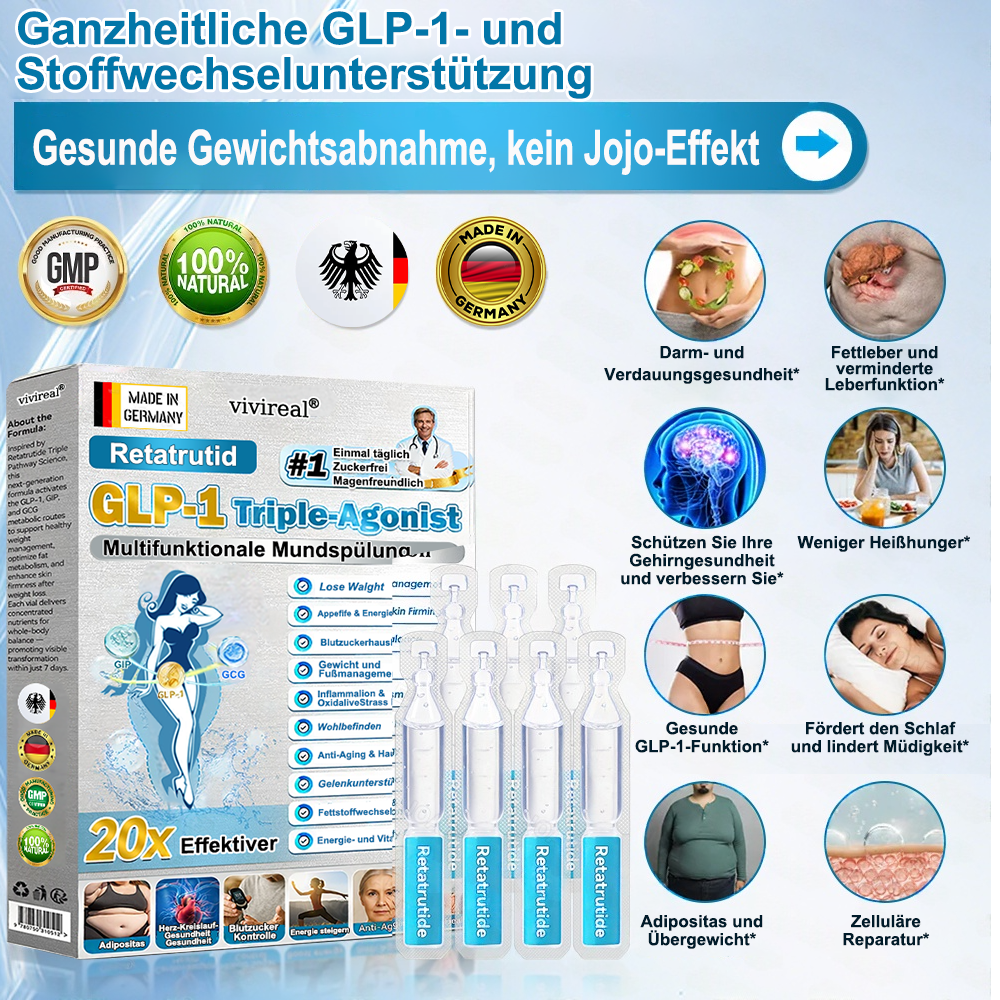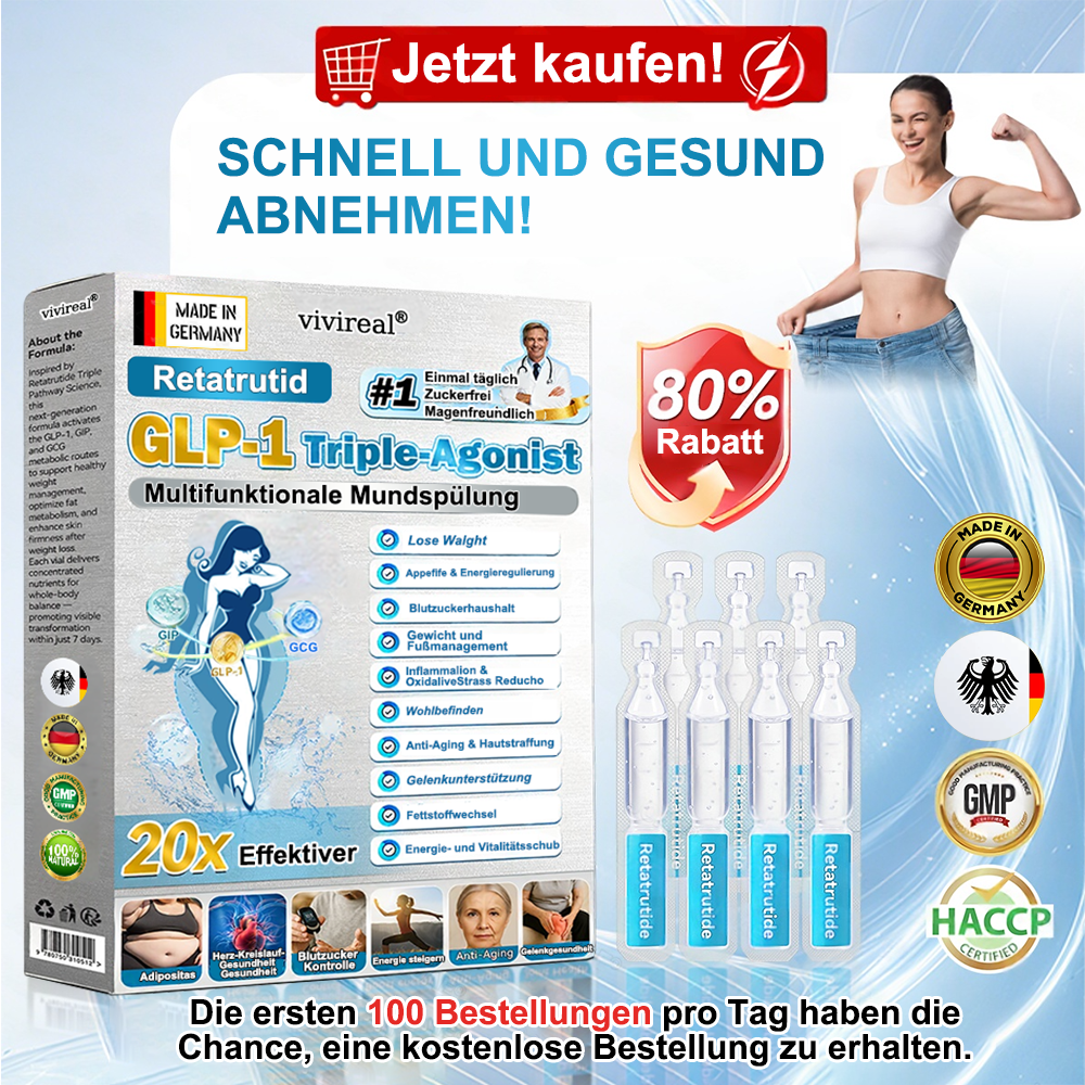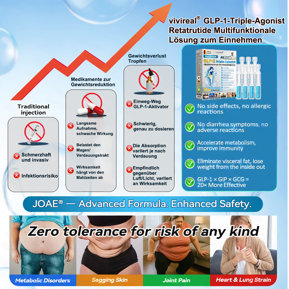 Wir sind ein Team von Endokrinologen, von denen viele selbst Erfahrung mit Adipositas und ihren Folgeerkrankungen haben โ und auch gรคngige GLP-1-Prรคparate zur Gewichtsreduktion mit begrenztem Erfolg ausprobiert haben. Diese Erfahrung motivierte uns, einen sicheren, natรผrlichen und effektiven Ansatz fรผr die Stoffwechselgesundheit und das Gewichtsmanagement zu entwickeln. In รผber 12 Jahren Forschung testete unser Team das Programm zunรคchst selbst, รผberwand die Einschrรคnkungen des einstufigen GLP-1-Systems und erzielte bemerkenswerte Ergebnisse mit demย Dreifach-Agonistenย -Mechanismus (GLP-1 ร GIP ร GCG)ย ohne Rebound-Effekt oder Nebenwirkungenย . Anschlieรend fรผhrten wir groร angelegte Studien und klinische Prรผfungen mit รผber 5.000 Teilnehmern durch, die die Wirksamkeit vonย VIVIREALยฎย ย Retatrutid GLP-1 Dreifach-Agonist Multifunktions-Lรถsung zum Einnehmenย in Bezug auf Stoffwechselregulation, Appetitkontrolle und allgemeine Gesundheitsverbesserung โ insbesondere bei Erwachsenen รผber 40 mit รbergewicht oder Adipositas โ weiter untermauerten. Unterstรผtzt durch aktuelle medizinische Forschung istย VIVIREALยฎย Retatrutidย GLPย ย -1 Dreifach-Agonist Die multifunktionale orale Lรถsungย hatย die strengen Zulassungsprรผfungen und Zertifizierungen der BfArM bestandenย , wobei Sicherheit, Wirksamkeit und Konformitรคt formell bestรคtigt wurden. Sie stellt eine wissenschaftlich fundierte Weiterentwicklung herkรถmmlicher GLP-1-Prรคparate dar und eignet sich ideal fรผr alle, die eine natรผrliche, sichere und wirksame Strategie zur Gewichtskontrolle und umfassenden Stoffwechselunterstรผtzung suchenย .