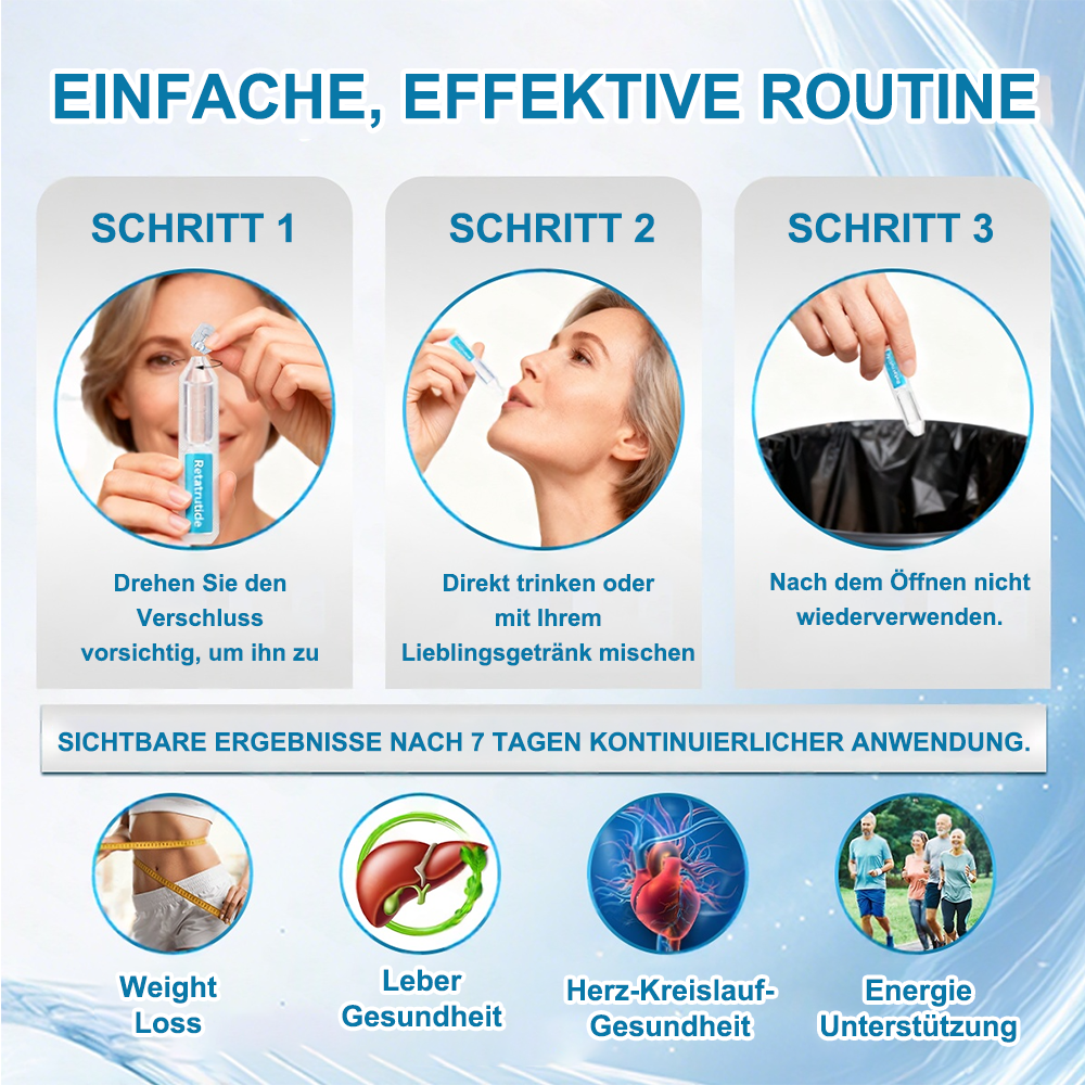 โ ย Leicht resorbierbarย : Die Formel verwendetย Retatrutide (GLP-1 ร GIP ร GCG)ย ย -Aktivatoren in einerย schnell resorbierbaren flรผssigen Formย , wodurch die wichtigsten Inhaltsstoffe direkt in den Kรถrper gelangen, ohne dass ein schwerer Verdauungsprozess erforderlich ist โ was sie magenschonender macht, insbesondere fรผr Menschen mit empfindlicher Verdauung.